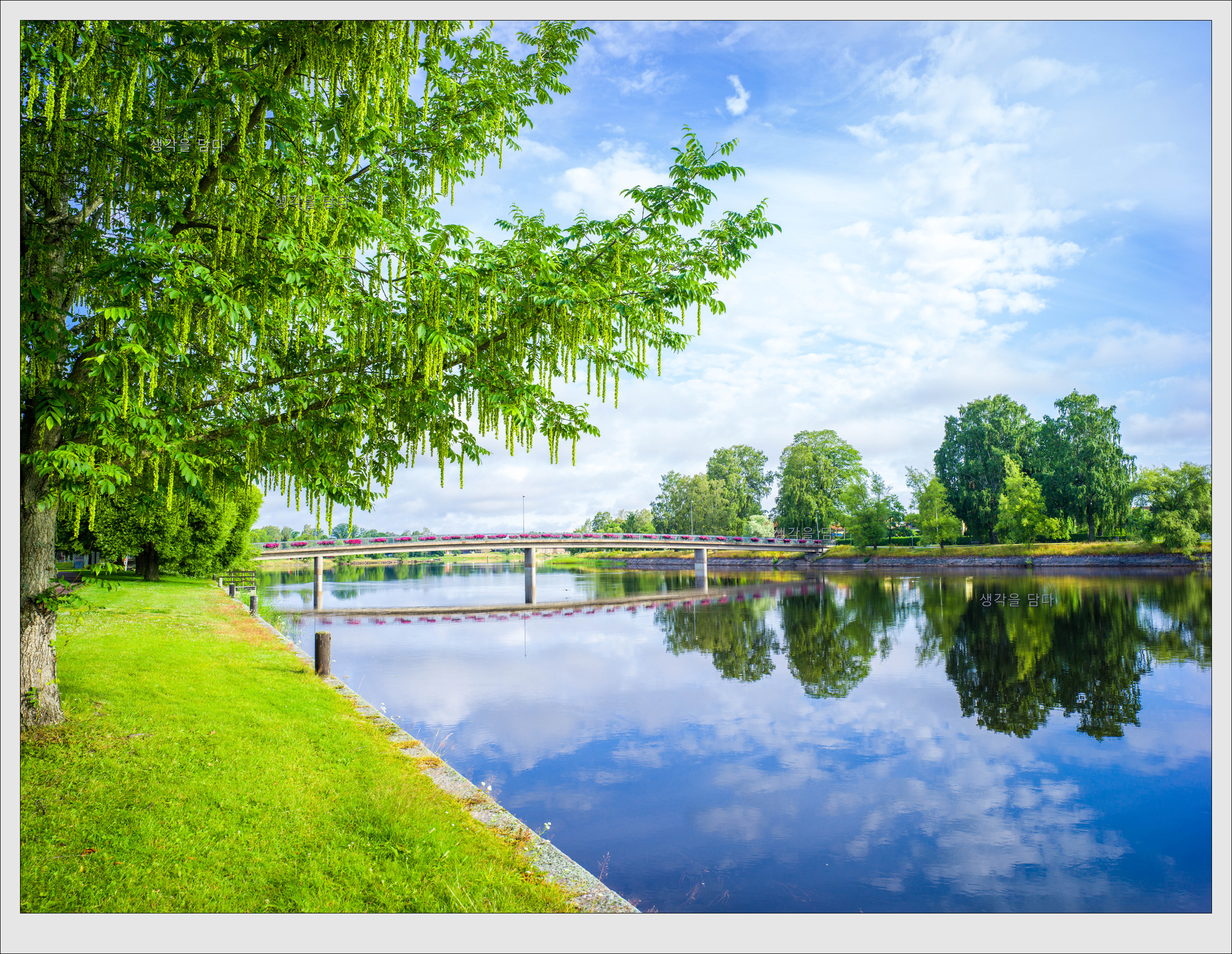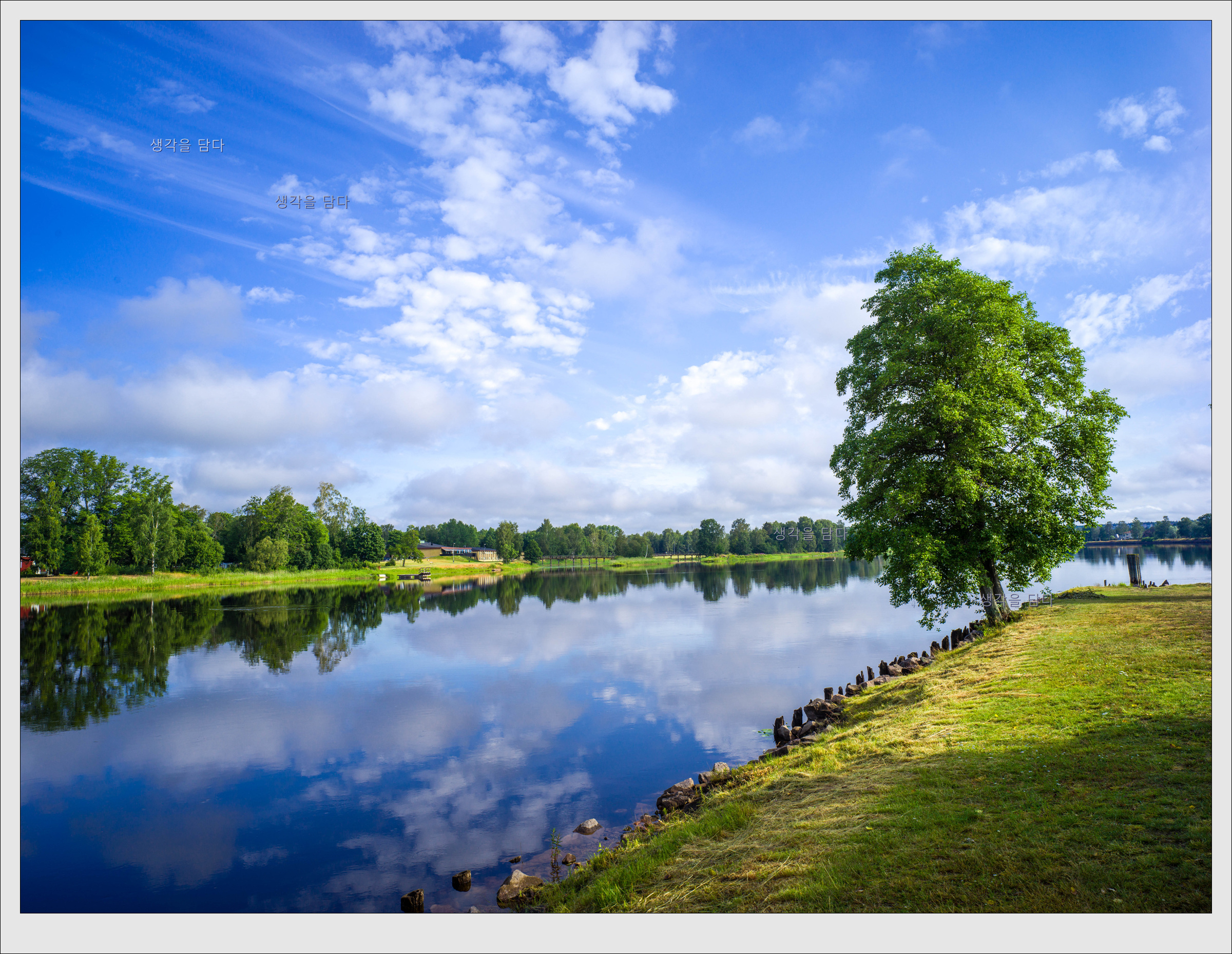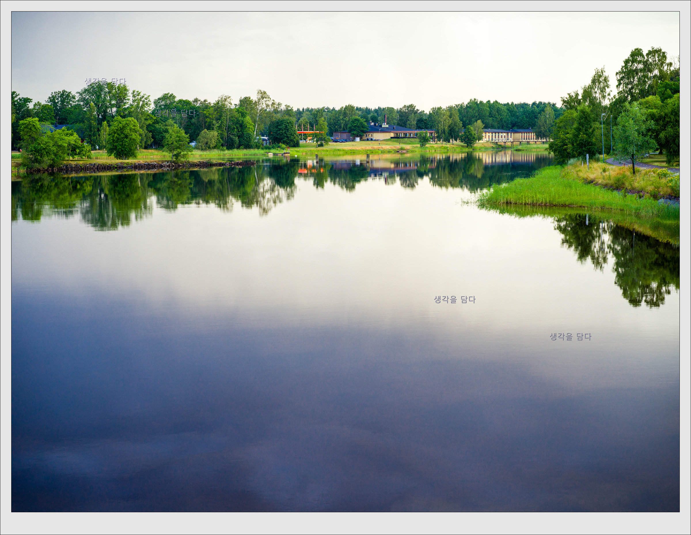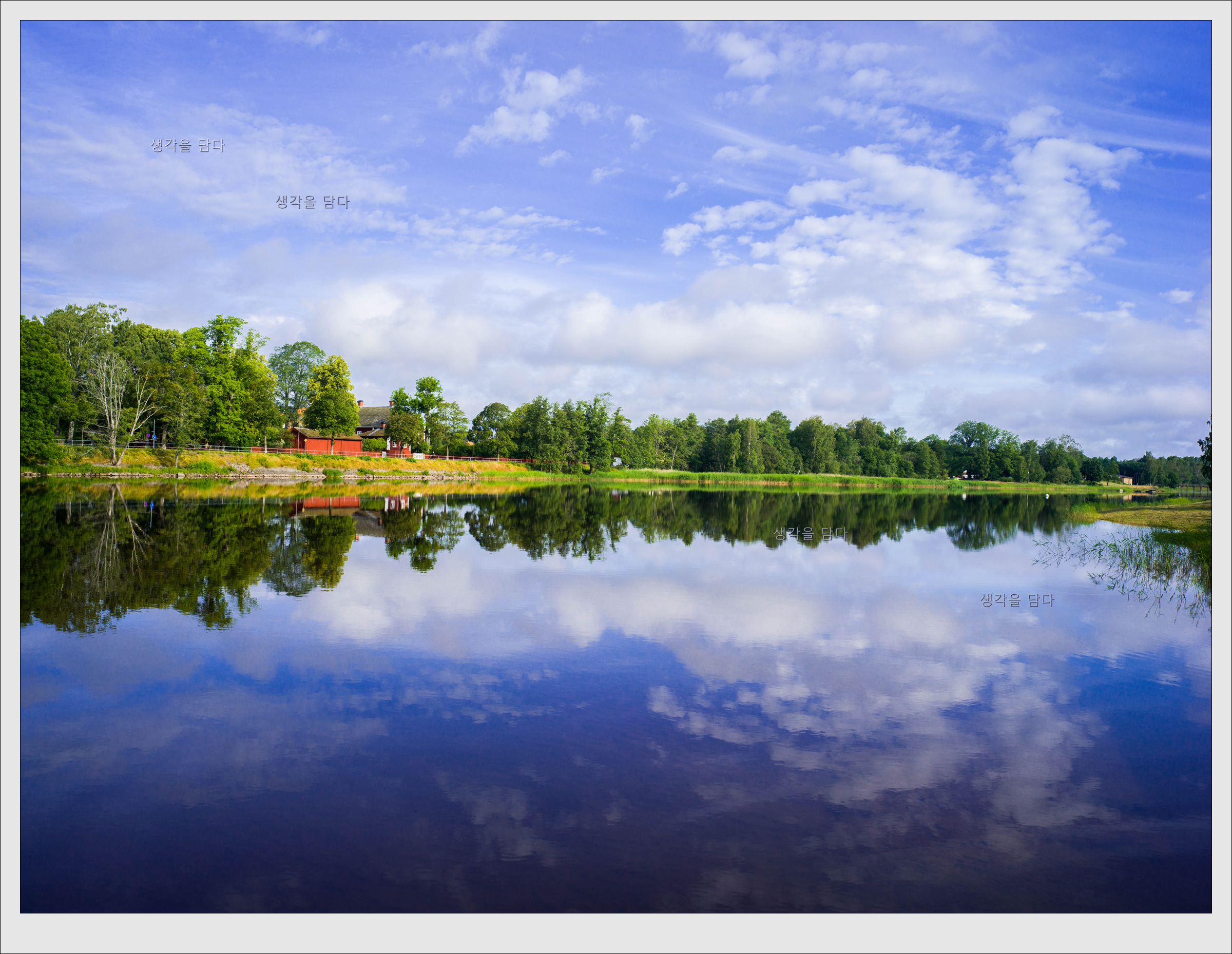그 거울처럼 잔잔한 강에 반영된 풍경이 마치 북유럽 느낌이 물씬 나는 한 폭의 수채화 같습니다.
